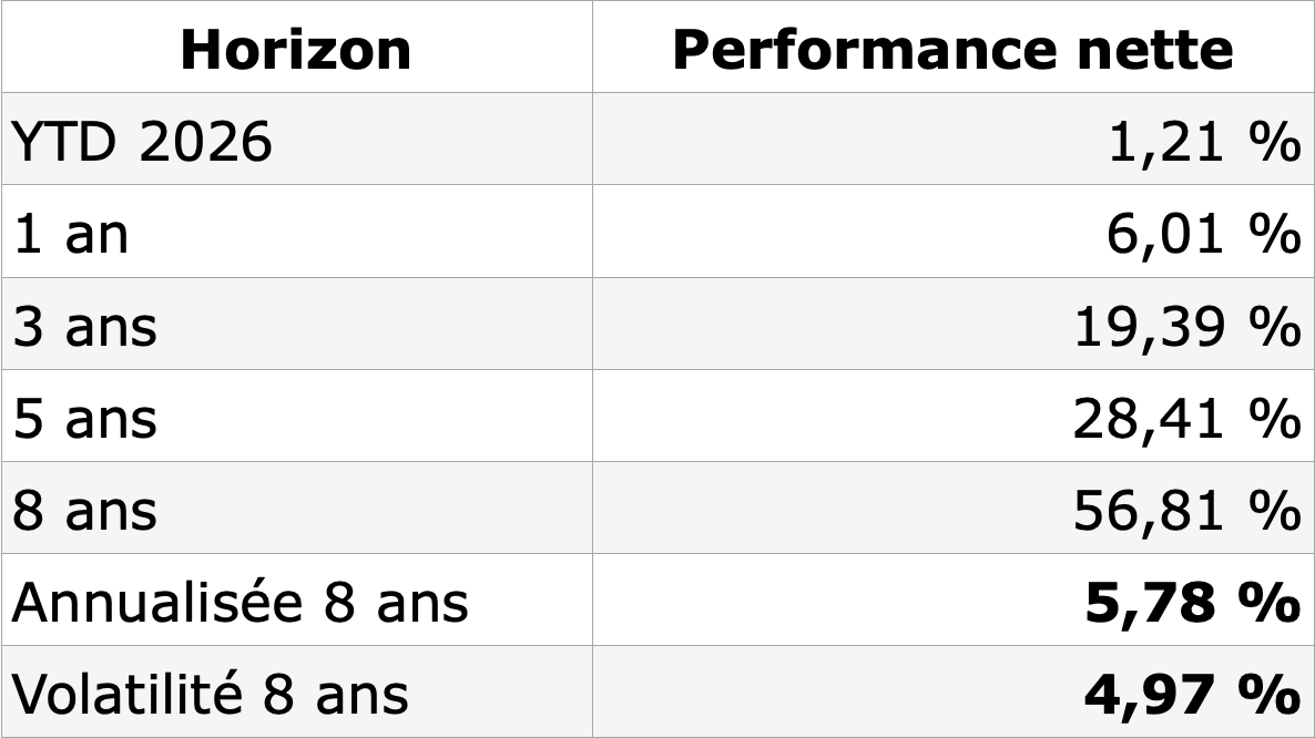 Un rendement annualisé de 5,78 % net avec une volatilité inférieure à 5 % constitue un profil intermédiaire rare. À titre de comparaison, il se situe au-dessus des meilleurs fonds euros boostés (autour de 3,5 à 4 %) et en dessous d'un fonds actions Europe diversifié (7 à 8 % annualisés sur longue période, mais avec une volatilité de 15 à 20 %).