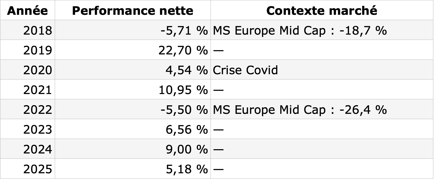 Le fonds a divisé par trois environ les reculs des indices Mid Cap européennes lors des deux vrais chocs de la période (2018 et 2022). Cette résilience apparente tient à deux mécanismes : la poche non cotée est valorisée trimestriellement, ce qui lisse mécaniquement les chocs intra-période ; et la gestion de la poche cotée s'est montrée prudente dans les phases de tension. Il faut néanmoins garder à l'esprit que le lissage comptable ne protège pas des pertes réelles au moment des cessions, il les diffère.